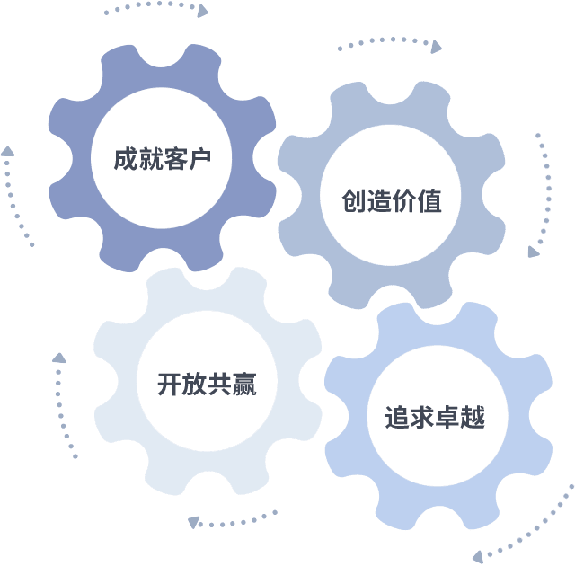成就客户是一切决策的出发点,,创造价值是衡量所有工作的标准,,追求卓越是我们做事做人的态度,,,,开放共赢是我们的格局也是最终的结果。。。价值观的齿轮环环相扣,,,,推动着组织里的每个人不断向前。。。