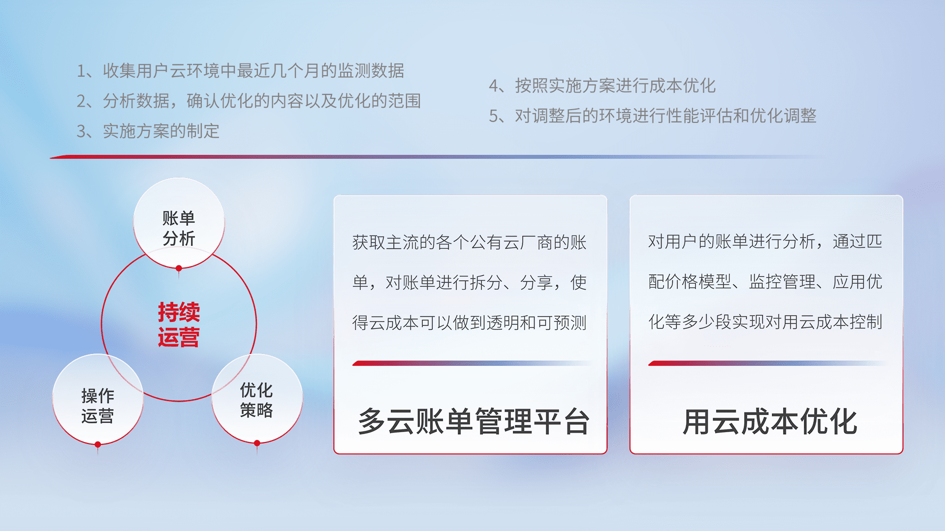 通过多云纳管,,,以统一的资源数据模型把客户的云资源进行抽象和封装,,,进而实现对多云资源的统一操作,,保障云资源管理的可靠性、、、、稳定性与可用性。。量身定制化运维内容,,,配置、、、、开发运维、、、、补丁管理、、备份、、监控、、、、认证和访问管理、、、、审计和日常巡检等,,,保障在用云过程中的可靠度,,稳定度以及高可用率。。。。