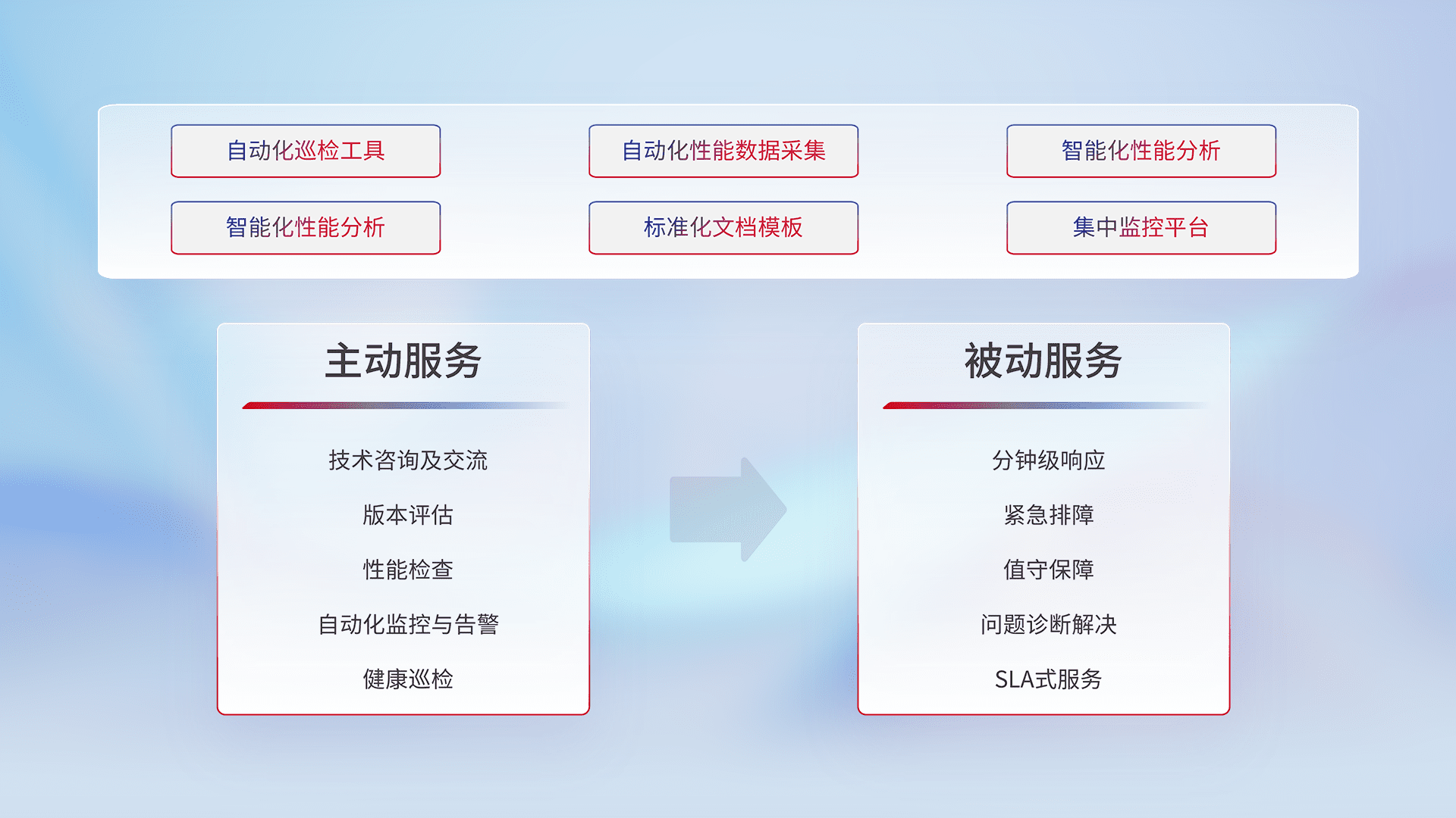 智能化工具和标准化文档,,保障服务质量,,提供主动服务(包含技术咨询、、、版本评估、、性能检查、、、、自动化监控与告警、、、、健康巡检)和被动服务包含(分钟级响应、、、、紧急排障、、、值守保障、、、、问题诊断解决、、、、SLA服务)。。。